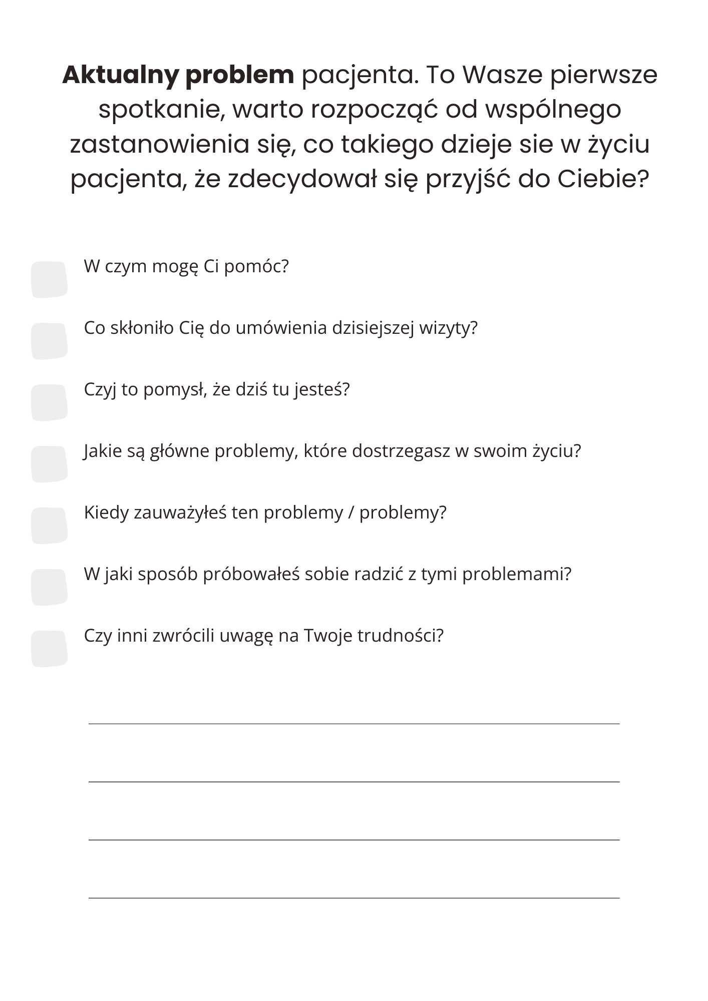 Bo to usystematyzowana lista, która pomoże Ci nadać strukturę pierwszym konsultacjom